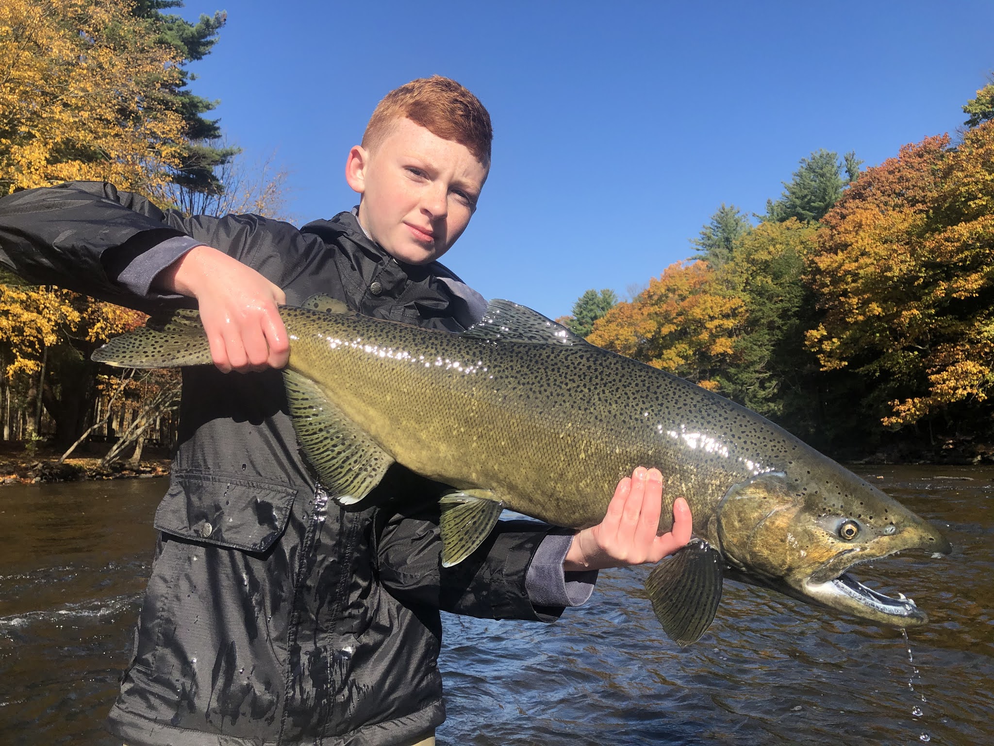 I was able to guide a few days down on the Delaware in September before the salmon run began on the Salmon River. Since the beginning of the run I've been on the Salmon River almost everyday. In September the run was sort of hit and miss but October has been extremely good with solid numbers moving though every day. It looks like the salmon numbers are slowing a little over the last couple days and the switch from salmon to trout has begun. We have been seeing more and more steelhead each day with around a half a dozen good steelhead hookups each trip. Here are a few highlights from this past month...